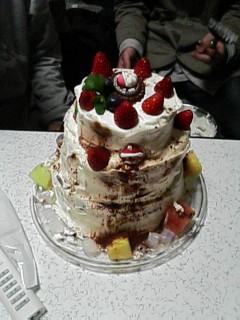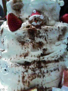 まああれです、売ってるスポンジ台に生クリーム塗って、スーパーで半額だったカットフルーツとサンタさんで飾りつけただけですけど。