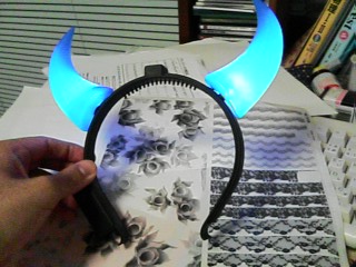 えーと、この角は見てのとおり光ってるんですけども、電池式なんですね。昔は三日もたてば光らなくなるようなもんばっか売ってた気がするんですけど。それって電池と豆球さえ交換すれば、来年も使えるってことですよね。でも、来年の流行が耳だったら、どうしよう。