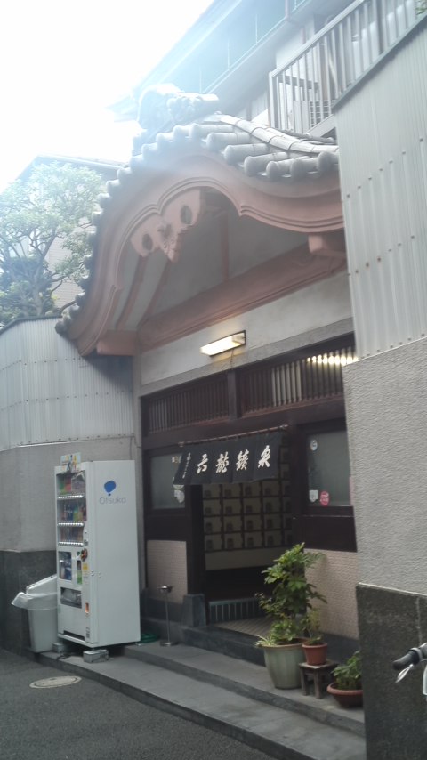 入り口はなんか商店街のお店みたいですが、これも古い作りの高天井の銭湯です。高天井の銭湯の浴室って、壁が青系の色のことが多くて、六龍鉱泉も日の出湯も例に漏れてませんけど、薄い青だったり緑みがかってたり、ちょっとずつ違いますね。