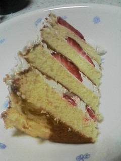 今年は我が部のシェフが飾り付けたので、とてもケーキの体を成しています。まあ、去年みたいな馬鹿くさいトッピングは禁止されましたが、断面もきれいじゃない!